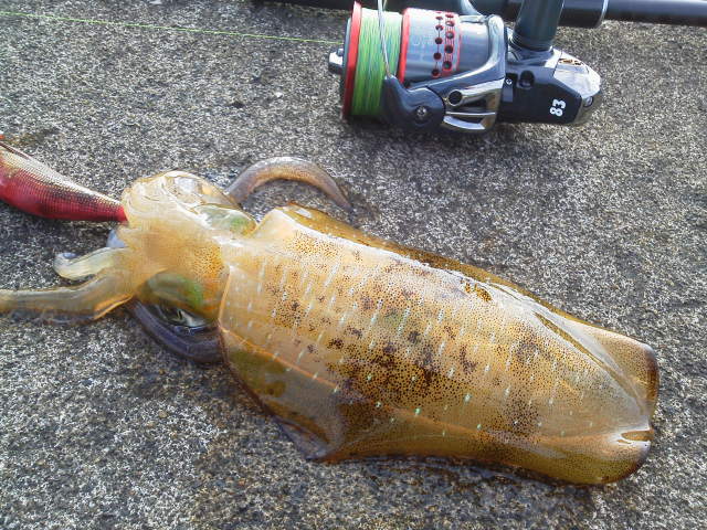 | アジも終わりに近づいたし、魚も思うように釣れないし・・・ってことで、軟体系に逃げることにしました。(笑) 今までですか?もちろん親なんて釣ったことありません。なのでオレ自身も半信半疑で実釣を開始しました。 午前中の仕事を終えて⇒昼メシ食って⇒ゆっくり出動。 途中でお買い物♪などしたもんだからポイントに着くころにはもう夕方です。 とはいえ一年で最も日が長い季節。まだ太陽は高い位置にありました。 先日カブラでいい思いしたので到着一番、まずは魚を狙いますが⇒ノーバイト。 ノッコミで真鯛が浅場に入ってきてるとはいえ水深は5m前後。 でも釣りに「絶対」はないから・・・と考えながら、あれ?五目狙いになってねーか?(爆) まぁいいです。これが釣り師の心理です。(釣れるもんはなんでも釣っちゃえ!的な) 八方美人に付き合ってくれる魚がいるはずもなく、そこでようやくエギを投げることにしました。 一投、二投、五投、八投・・・ポイントを換えながら探っていきます。 一通り探り終えたところで最初のポイントが気になってまた戻ります。(これも釣り師の心理) その二投目。アクションからリトリーブに入ったところで藻に引っかかったような感触。 「あれ?さっきこんげとこに根なんかあったっけ?」 もいちど大きくシャクってリトリーブに入った瞬間、穂先にぐぅぃーーーっと重さが乗りました。 間髪入れず合わせをくれると 「Gyun!Gyun!Gyui------------!」 なんと、イカちゃんいました。(笑) それもどうやら特大サイズです。(汗) 「Gyun!Gyun!」はあっても「Gyui--------------!」と走られる経験は初めてで、 ひん曲がる竿+めちゃ重っ+ギチギチに締めてあるドラグをもろともせず、イカちゃん、止まりません。 ここで、 何を考えてたのか?雷雲から退避してた待機組みを携帯で呼びます。 「親、キターーーーーー!親っ!親ーっ!」 実は釣り道具をメインの車ごと佐渡に置いてきてまして・・・タモを持ってないんです。 こっちの車の中にホタルイカ用の網(子供の水遊び用)があったので、それを? いや、水面まではおおよそ5m。どう考えても届くはずなどないんですが。(藁をもすがる) さてイカのほうはというと最初のつっこみこそ強烈だったものの、徐々にその姿を見せ始めました。 足元から10mほど先で浮き始めますが、その重量感が示すとおり 「でかっ」 胴長だけでも30〜40cmはありそうです。 最後の抵抗!足を大きく広げて⇒その後一気に逆噴射! ヒラヒラとあおる耳の部分は・・・あれ?ずんぐりむっくり? 力尽きて足元5mにぶら下がるその姿、 「でかっ、でも、コウイカだ!」 カンナに足二本が引っかかってます。 どーせ網は届かないだろうし、本命とはちっと違う。 ダメもとでライン持って引き抜いちゃえ! 「 あ、」 ・・・はい。そこから先は皆様ご推察の通り、 「ナチュラルリリーーース」 ダメ元でした。(笑) 自分の重さが味方になってくれた甲イカくん、元気に海へと帰って行きました。 後で冷静に考えるとテトラ側から掬えたかな?とか、 電話してる間にせめて画だけでも撮ればよかったかな?とか、 せめて皆に見せてから引っ張り上げれば、とか・・・ もし、せめて、タラレバ・・・ 過去に甲イカは釣ったことがありますが、あんげな化け物は初めてです。 ただ、釣れた証拠はなにひとつありません。(ってか、あこまでデカくなるんかいな?) 信じるか?信じないか?は、あなた次第です。 |