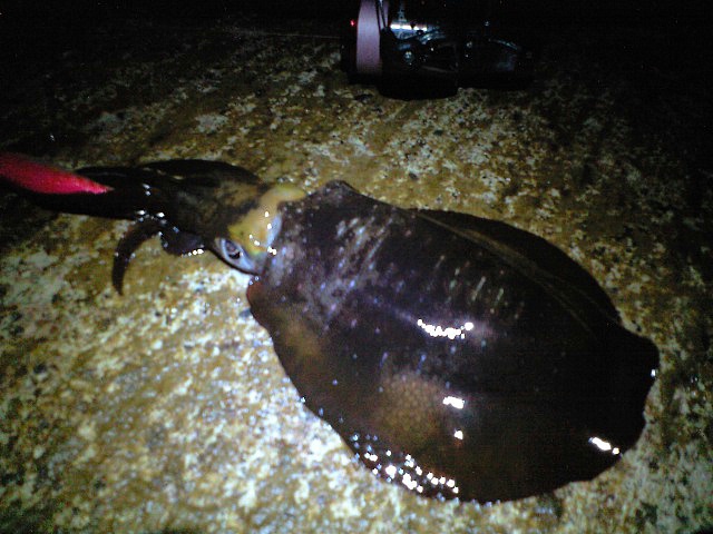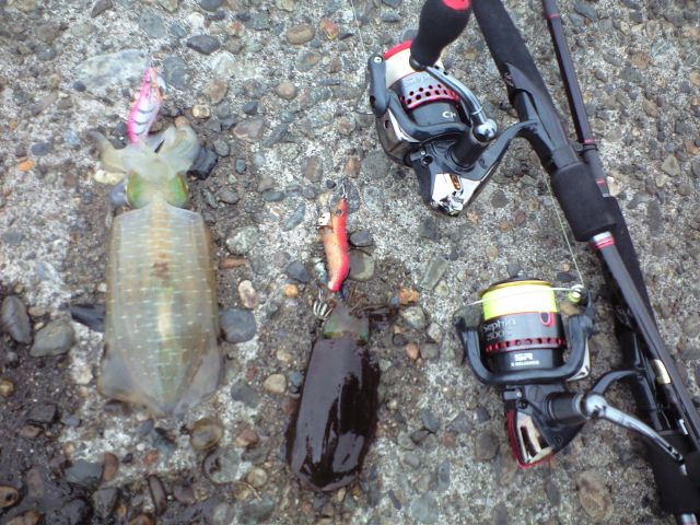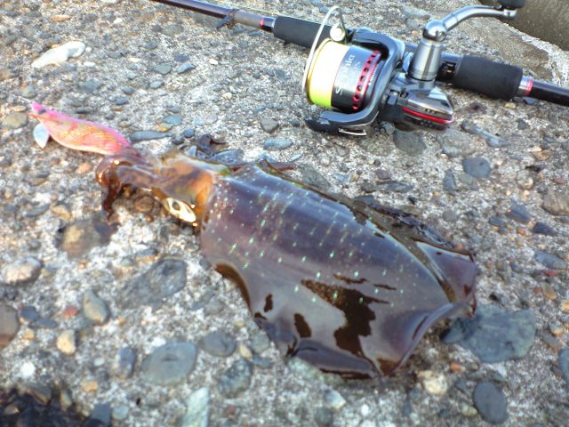 足元でエギにアタック!してきたのが見えたので、車にルアー取りに行って⇒ジグに付けなおして⇒足元でチョンチョンとしたらGatun! ありゃ?意外にでかい?タモ持ってねーしどーしょ?と思ったら、隣りでジグ振ってた兄ちゃんが手でランディングしてくれました。(感謝!) |