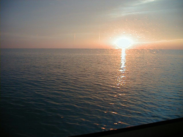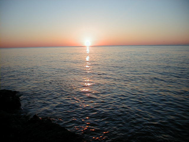 | 日本海に沈む夕日はいっぱい目にするけど、霞むことなく水平線に沈む夕日はちょー珍しいのだ。「ジュ〜」っていう音が聞こえそうでしょ? |